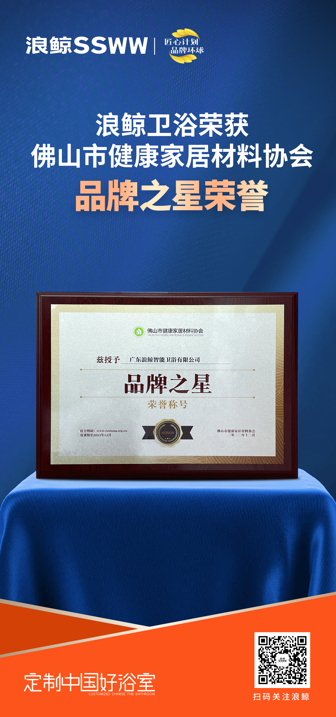 3月5日,由中國科技產業(yè)化促進會 建筑空間與健康專業(yè)委員會作為指導單位,佛山市健康家居材料協(xié)會,泛家居品牌學院承辦,廣州設計周作為支持單位,組織發(fā)起的 “健康家居美學大會暨 2022 佛山市健康家居材料協(xié)會年度大會”在廣州隆重舉行,浪鯨衛(wèi)浴榮獲“品牌之星”的榮譽稱號。