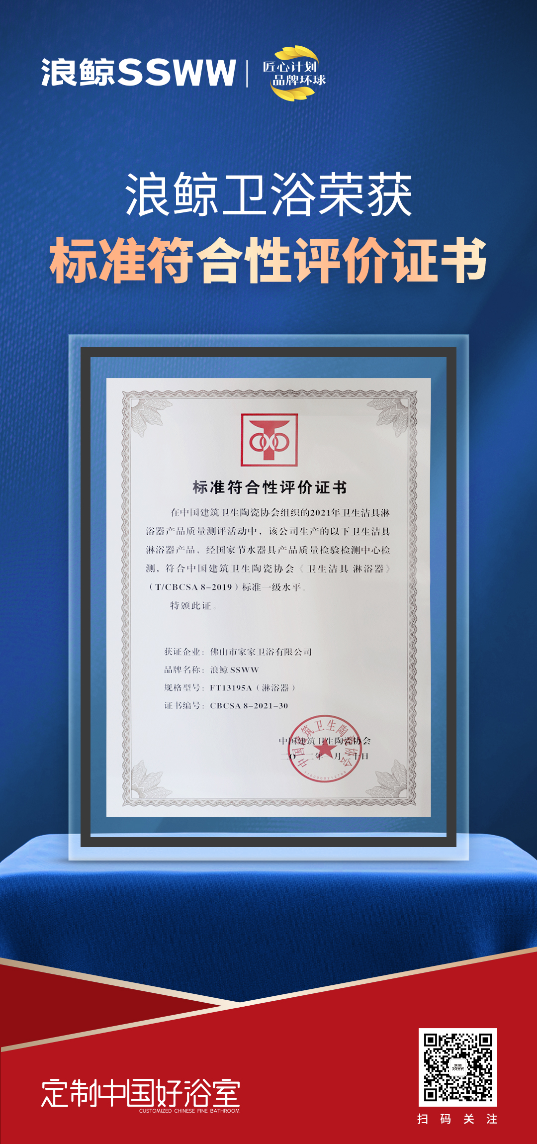 ??2022中國衛(wèi)浴五金產(chǎn)業(yè)發(fā)展論壇上,浪鯨衛(wèi)浴憑借卓越的產(chǎn)品實力,在2021年衛(wèi)生潔具淋浴器產(chǎn)品質(zhì)量測評活動中,浪鯨衛(wèi)浴面盆龍頭(FD11181-1)和淋浴器(FT13195A)兩款產(chǎn)品,經(jīng)國家節(jié)水器具產(chǎn)品質(zhì)量檢驗檢測中心檢測,符合中國建筑衛(wèi)生陶瓷協(xié)會標(biāo)準(zhǔn)一級水平,獲頒《標(biāo)準(zhǔn)符合性評價證書》榮譽(yù)獎項。
