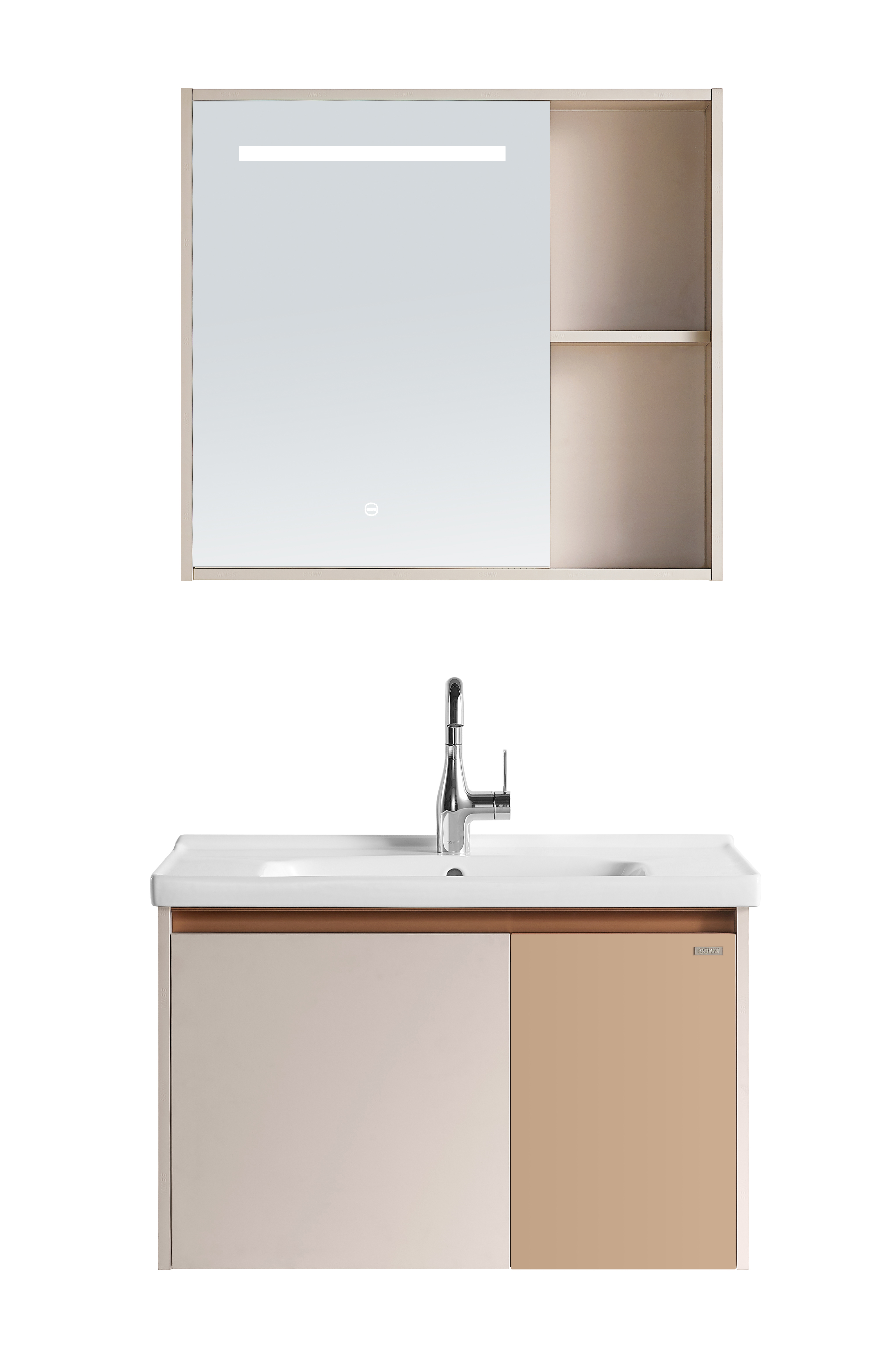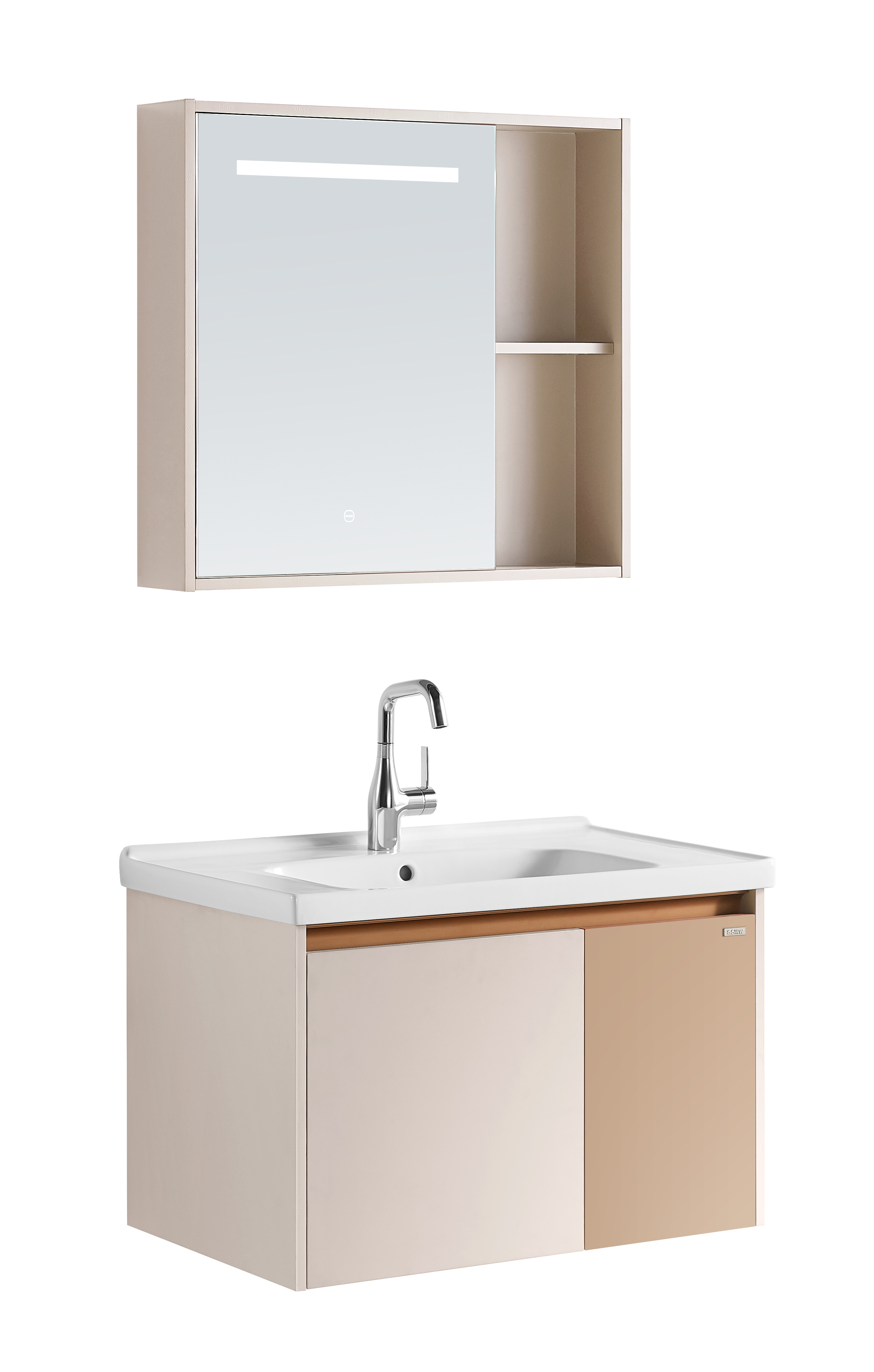 全柜 : 805X485X1850mm 主柜 : 774X468X480mm 鏡柜 : 760X140X687mm 主色調(diào) : 淺杏卡其 + 膚感橙 材質(zhì):鋁合金復合板材 陶瓷盆:CL3612/805×485×215mm