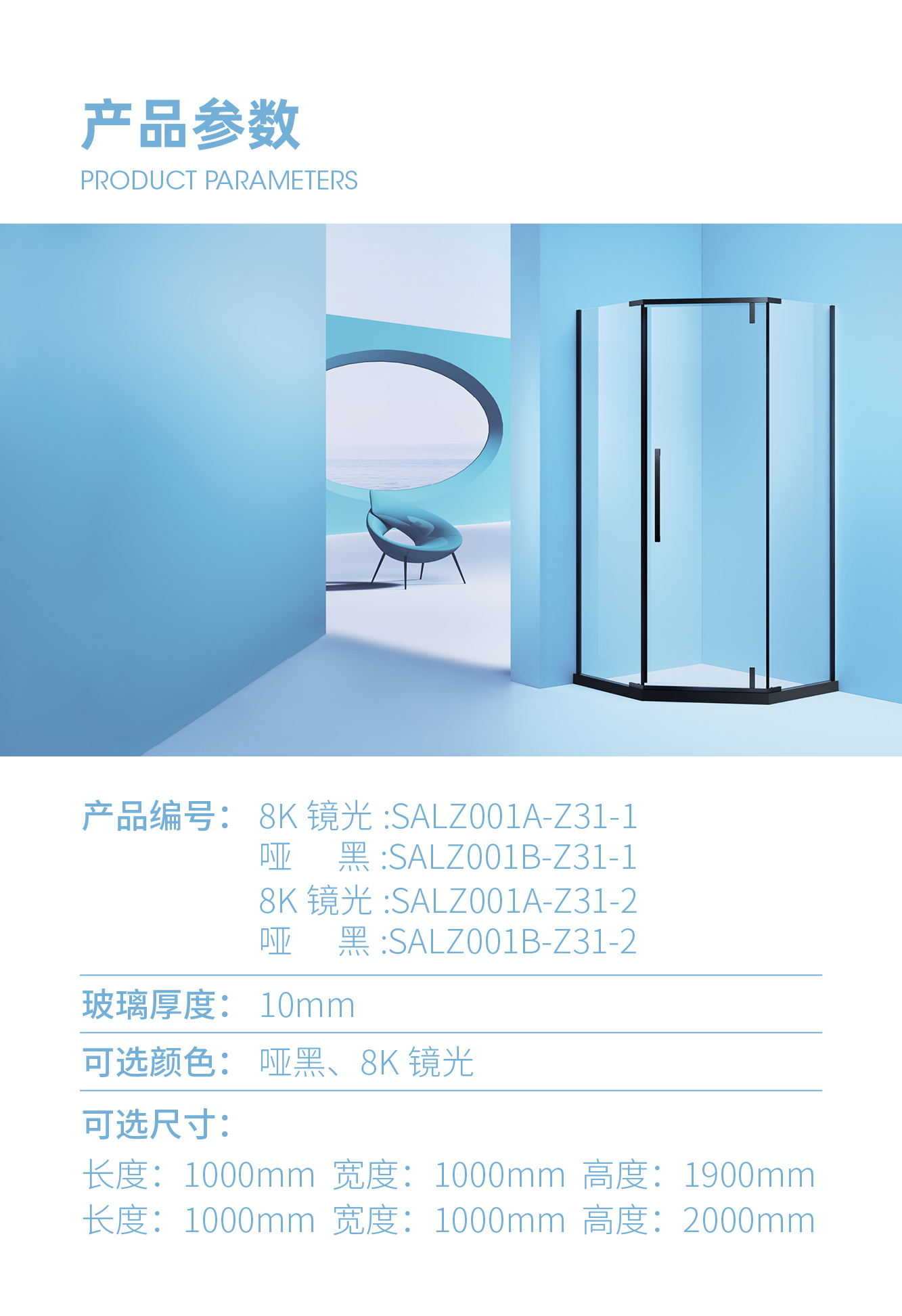 可訂做尺寸: 1000X1000X2000mm 五 金 顏 色: 啞黑 調(diào) 節(jié) 范 圍: 0~10mm 的傾斜度 玻 璃 厚 度: 10mm